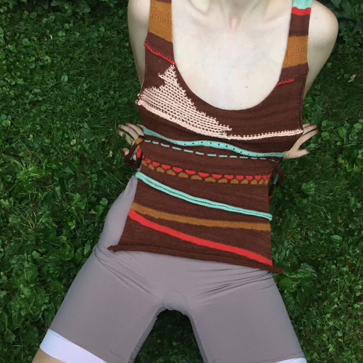 This project was a practice in translating an image into knit. I used different techniques on the Silver Reed knitting machine (ottoman stitch, picot holes, weaving in etc) to create different lines, shapes, and textures. I looked at Hudson River Paintings for the imagery, as well as the textures and unusual color schemes. I think there is a beauty in the very simple silhouette, which was limited by (my experience using) the knitting machines.